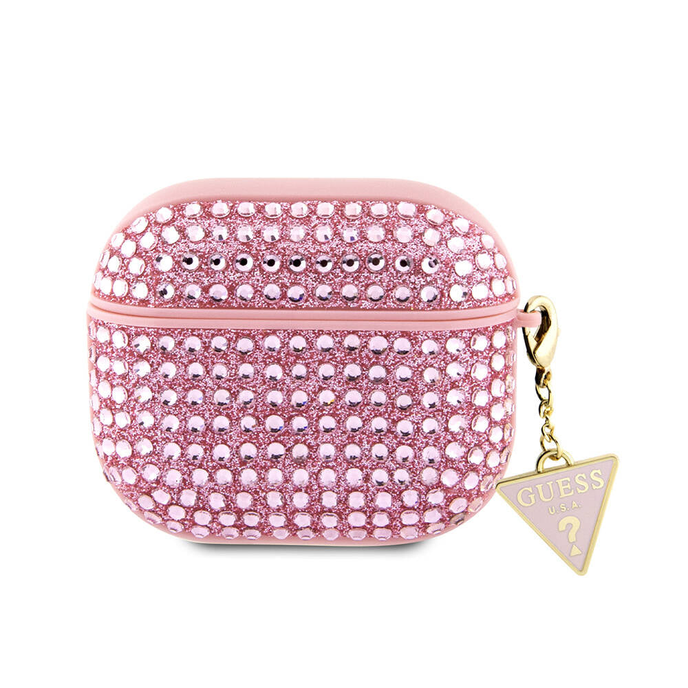 Apple Airpods 3. Nesil Kılıf Guess Orjinal Lisanslı Parıltılı Taş Kaplamalı Üçgen Logo Süs Zincirli Kapak Pembe