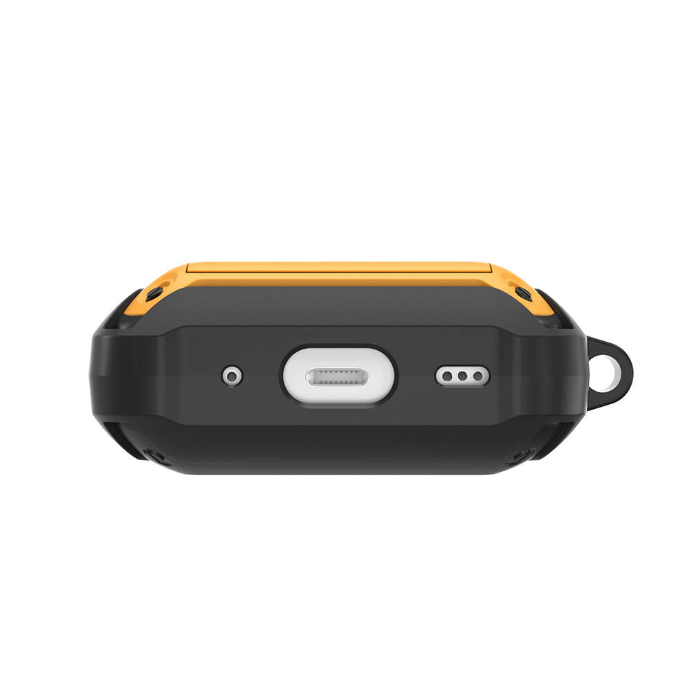 Üst kapağı kolayca açıp kilitleyebileceğiniz bu tasarım, kapağın her zaman güvenle kapalı kalmasını ve düşmesini önler. Taşınabilir metal karabina, AirPods Pro'nuzu her yere rahatça taşımanıza olanak tanır, bu sayede günlük maceralarınızda müziğinizden asla ayrı kalmazsınız.