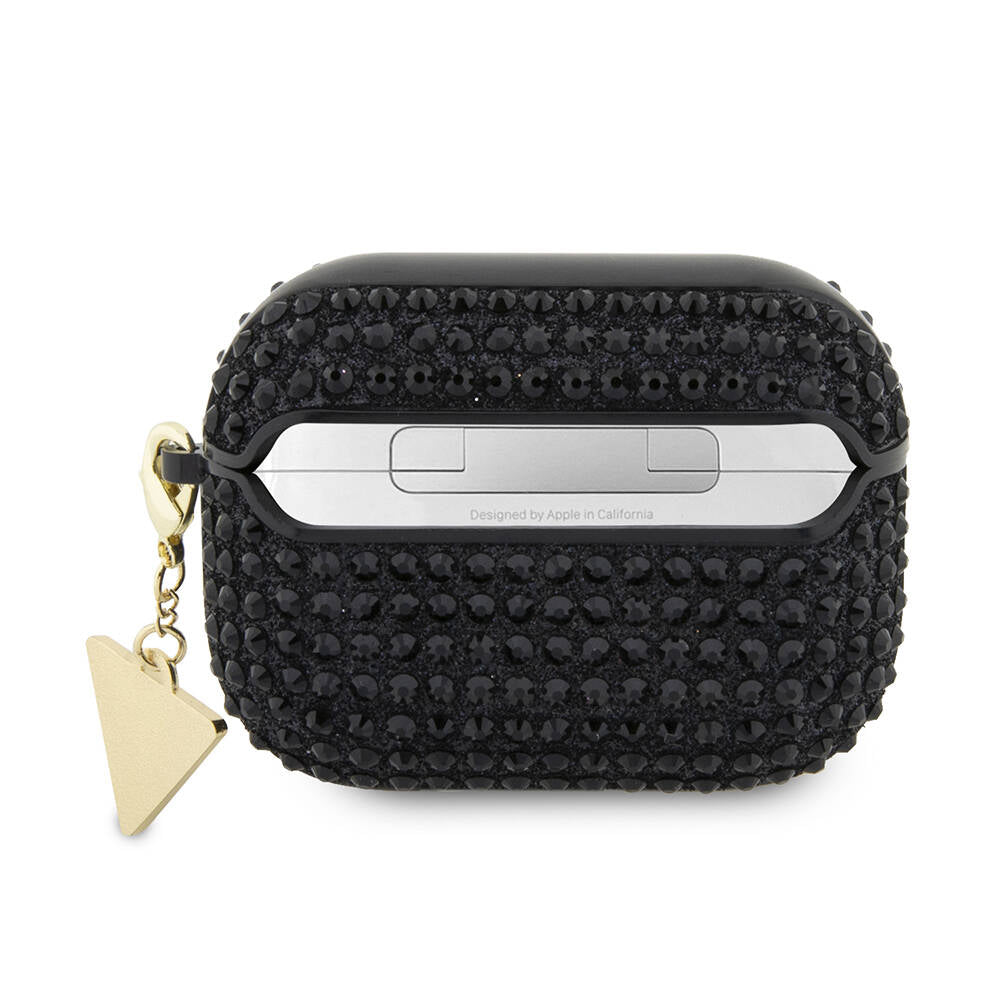 Apple Airpods Pro 2 Kılıf Guess Orjinal Lisanslı Parıltılı Taş Kaplamalı Üçgen Logo Süs Zincirli Kapak Siyah
