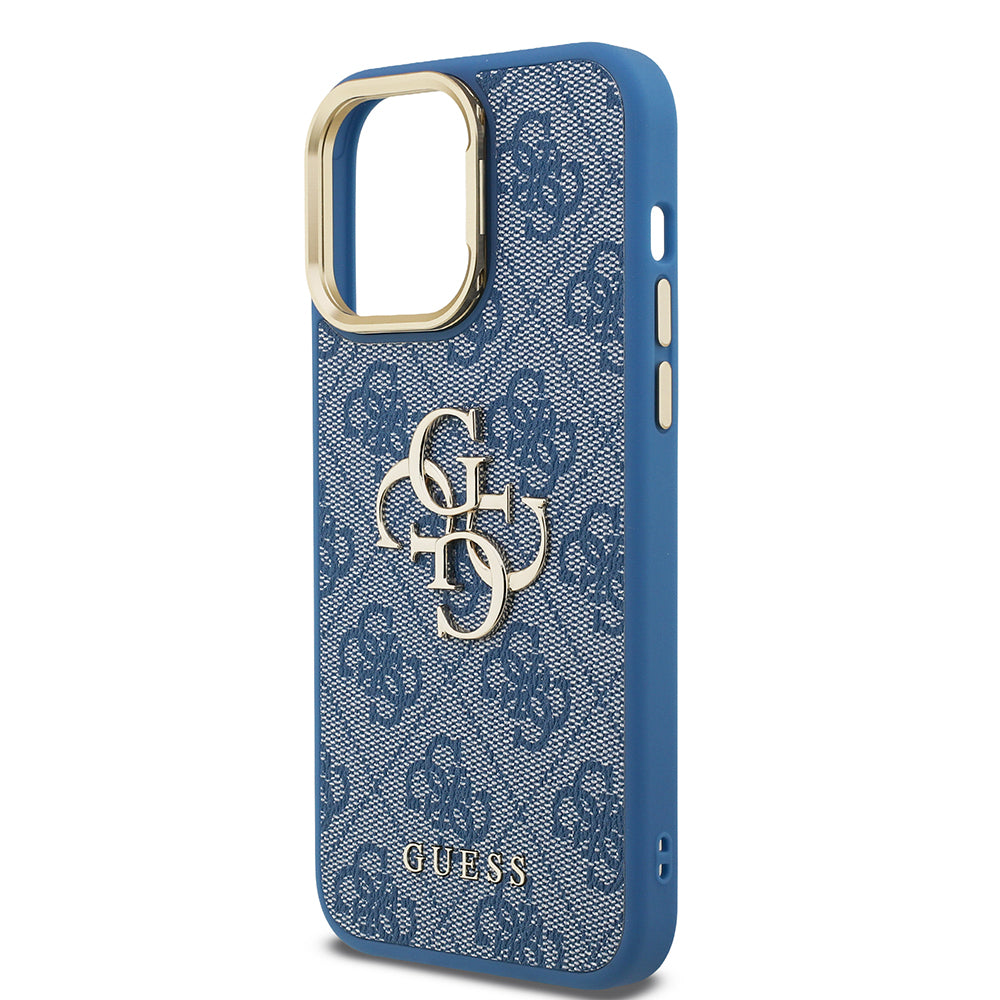 Apple iPhone 13 Pro Max Kılıf Guess Orjinal Lisanslı PU Deri 4G Desenli Metal Büyük 4G ve Yazı Logolu Kamera Standlı Kapak Mavi