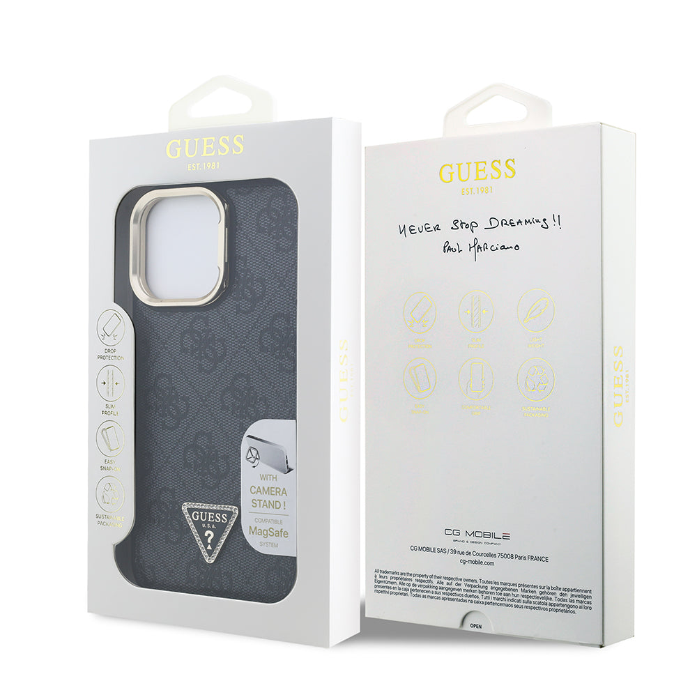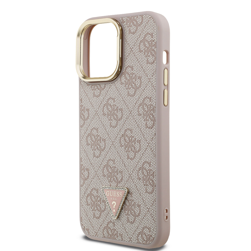 iPhone 13 Pro Max Kılıf Guess Orjinal Lisanslı PU Deri Taşlı Üçgen Logo 4G Desenli Kamera Standlı Kapak