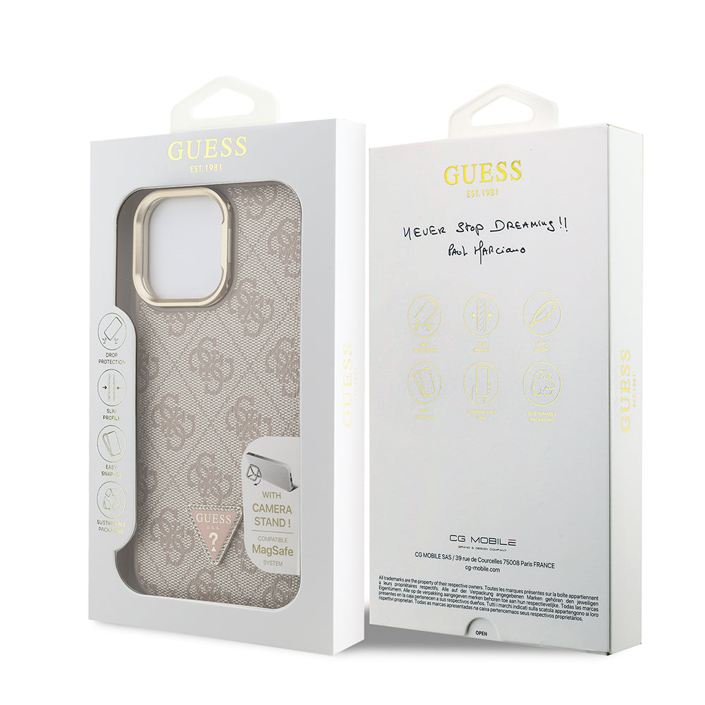 iPhone 13 Pro Max Kılıf Guess Orjinal Lisanslı PU Deri Taşlı Üçgen Logo 4G Desenli Kamera Standlı Kapak