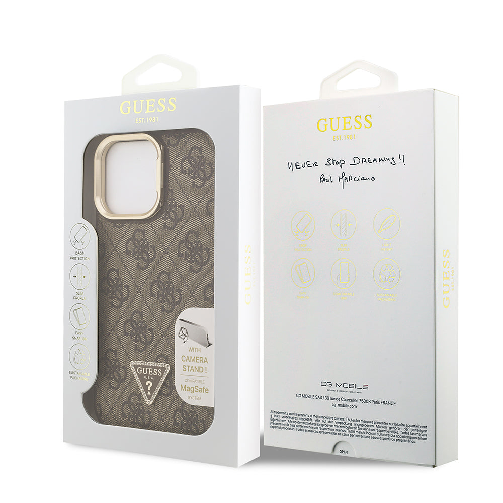 iPhone 13 Pro Max Kılıf Guess Orjinal Lisanslı PU Deri Taşlı Üçgen Logo 4G Desenli Kamera Standlı Kapak