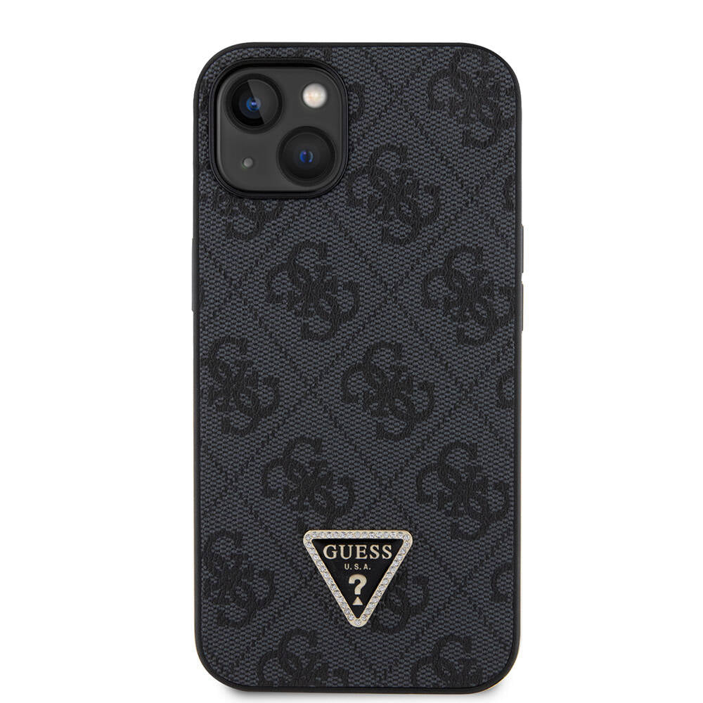 Apple iPhone 14 Kılıf Guess Orjinal Lisanslı PU Deri Taşlı Üçgen Logo 4G Desenli Kapak Siyah
