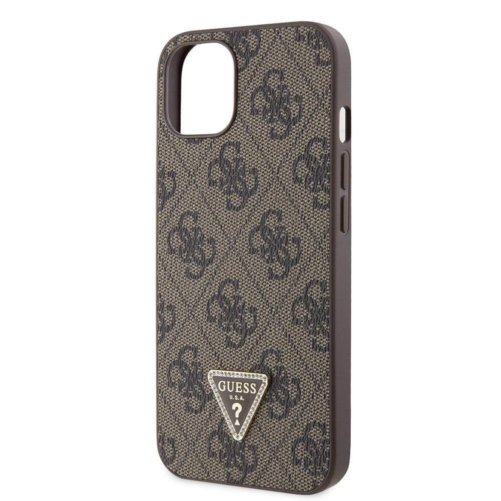 Apple iPhone 14 Kılıf Guess Orjinal Lisanslı PU Deri Taşlı Üçgen Logo 4G Desenli Kapak Kahverengi