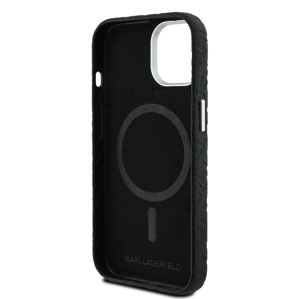 Apple iPhone 14 Kılıf Karl Lagerfeld Orjinal Lisanslı PU Deri Damgalı Metal Yazı Logolu Kapak Siyah