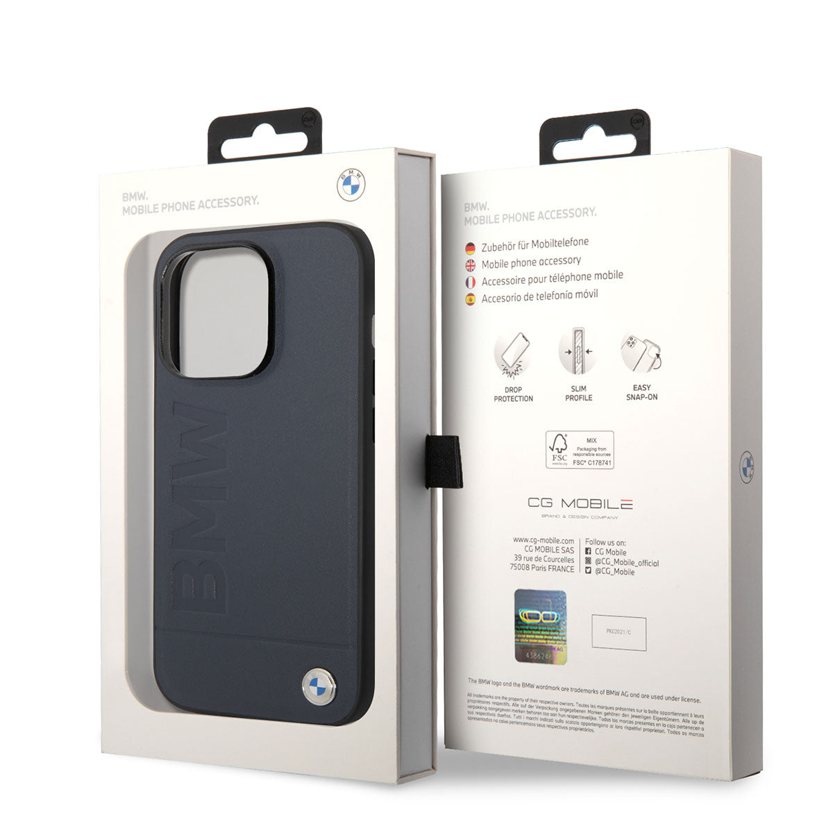 Apple iPhone 14 Pro Kılıf BMW M-safe Şarj Özellikli Deri Sıcak Mühür Baskılı Logo Dizayn Kapak Petrol Mavi