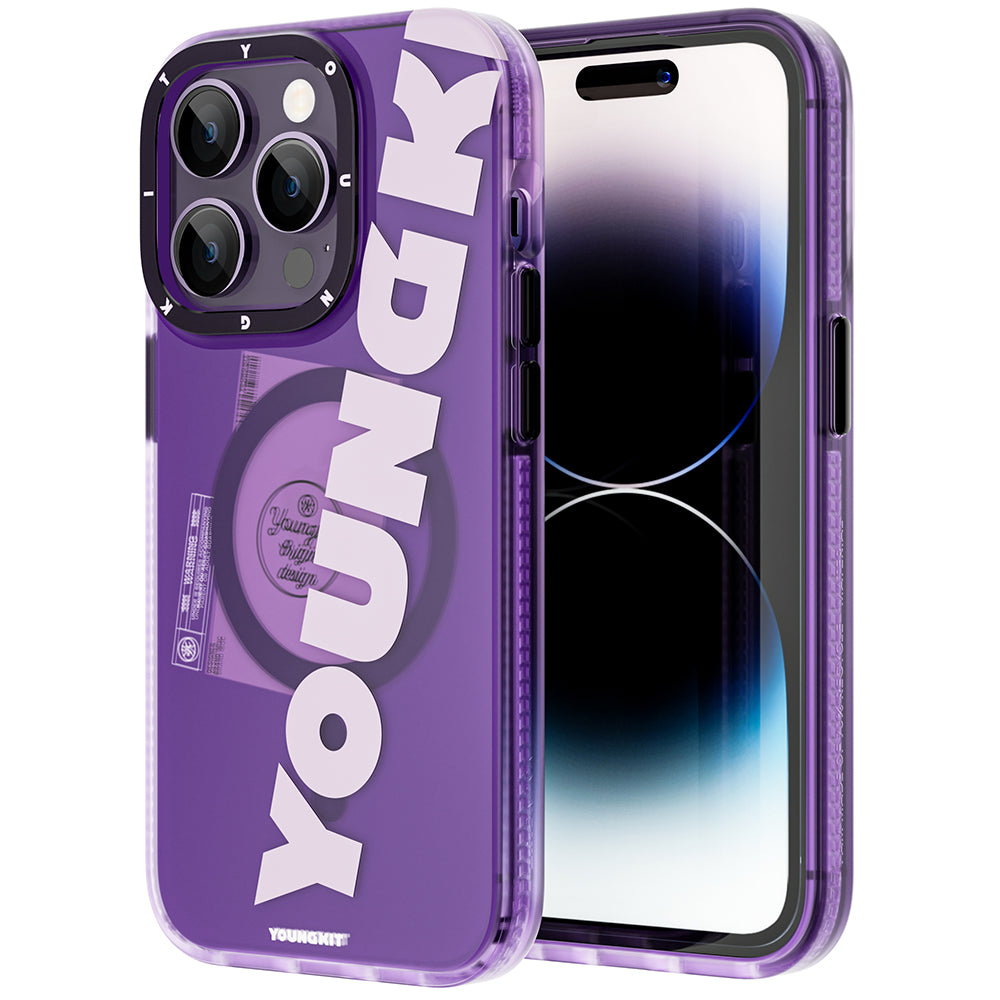 Apple iPhone 14 Pro Kılıf M-safe Şarj Özellikli Youngkit Binfen Serisi Yazı Temalı Kapak Mor