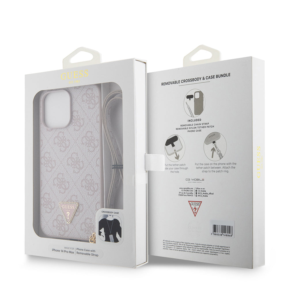iPhone 14 Pro Max Kılıf Guess Orjinal Lisanslı PU Deri Taşlı Metal Üçgen Logolu Çapraz Vücut Askılı 4G Desenli Kapak