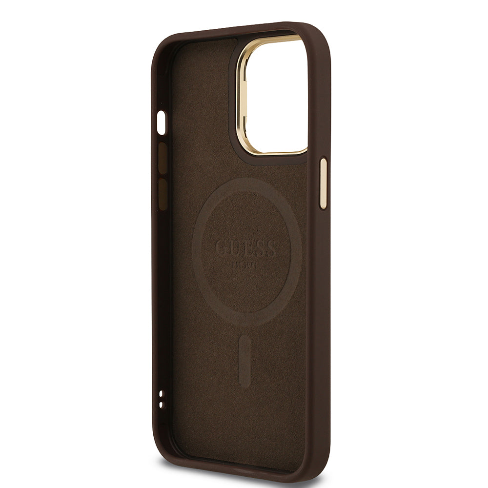iPhone 14 Pro Max Kılıf Guess Orjinal Lisanslı PU Deri Taşlı Üçgen Logo 4G Desenli Kamera Standlı Kapak