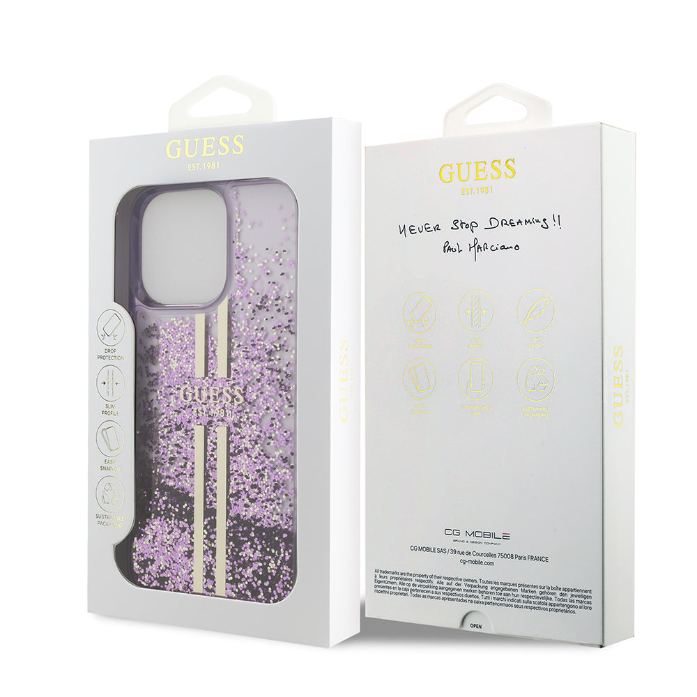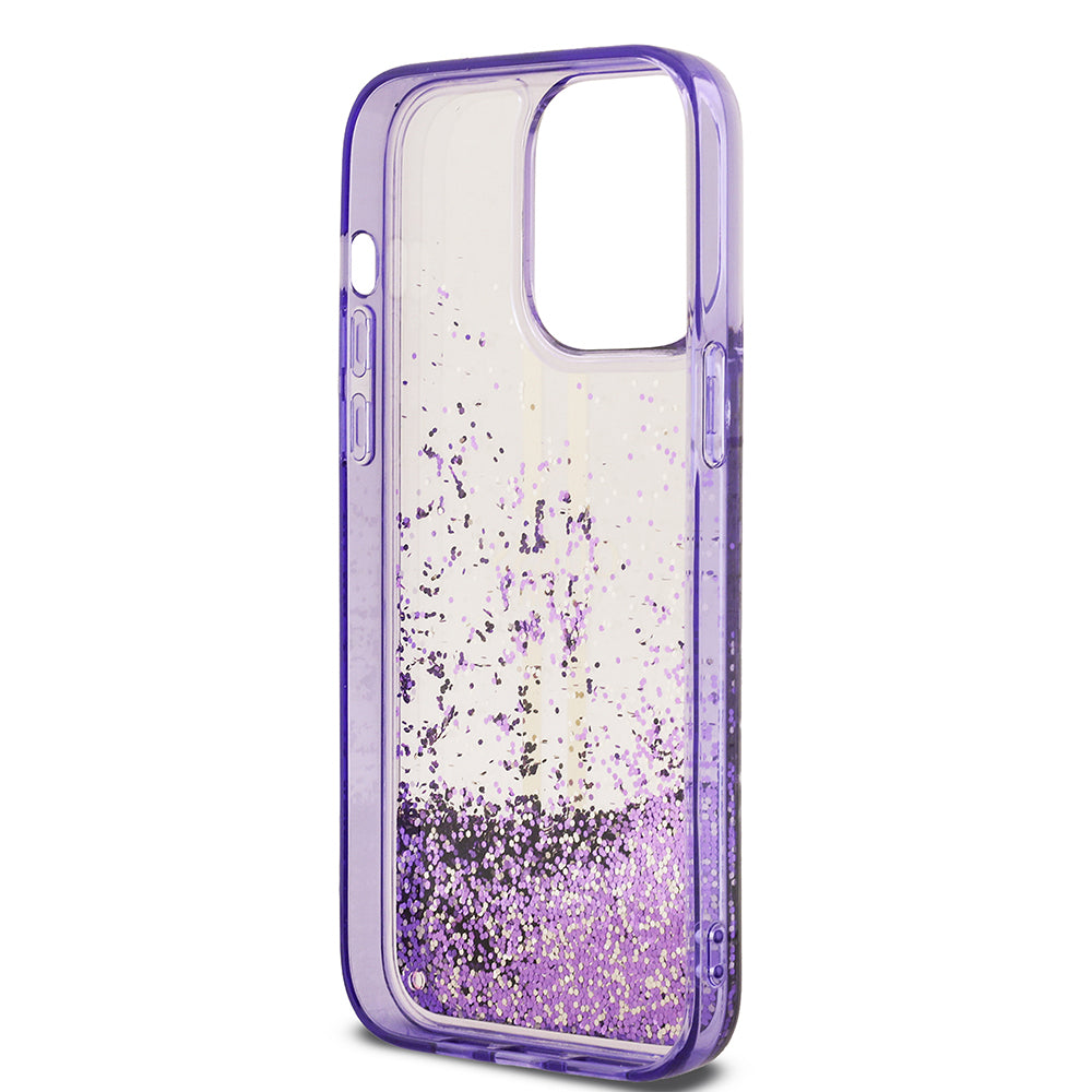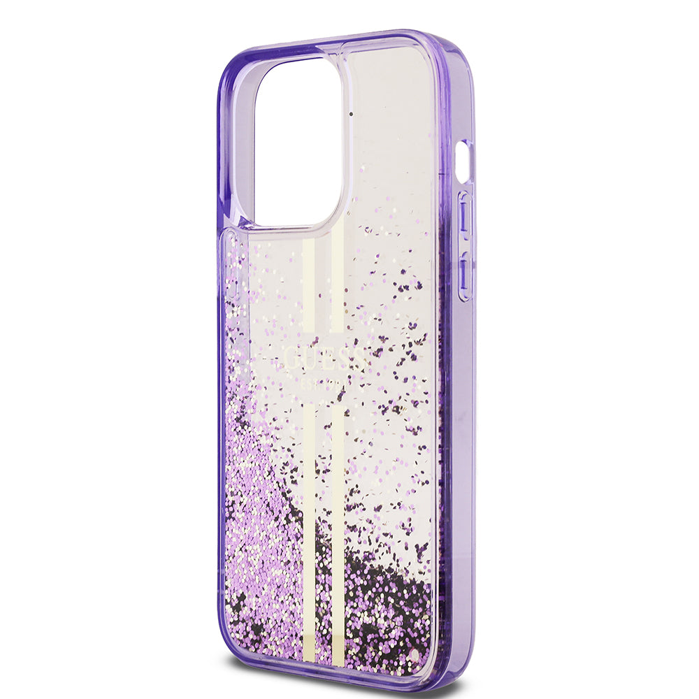 Apple iPhone 14 Pro Max Kılıf Guess Orjinal Lisanslı Transparan Sıvılı Simli Altın Çizgili Kapak Mor