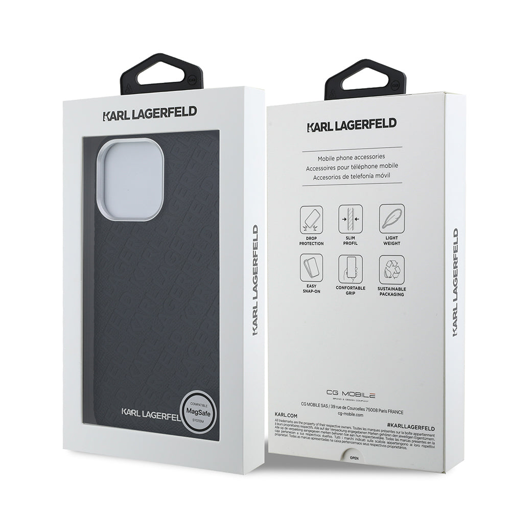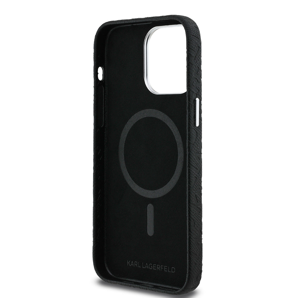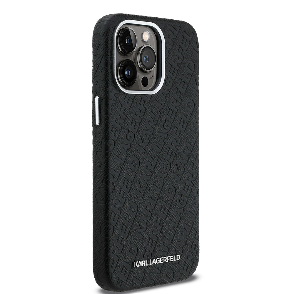 Apple iPhone 14 Pro Max Kılıf Karl Lagerfeld Orjinal Lisanslı PU Deri Damgalı Metal Yazı Logolu Kapak Siyah