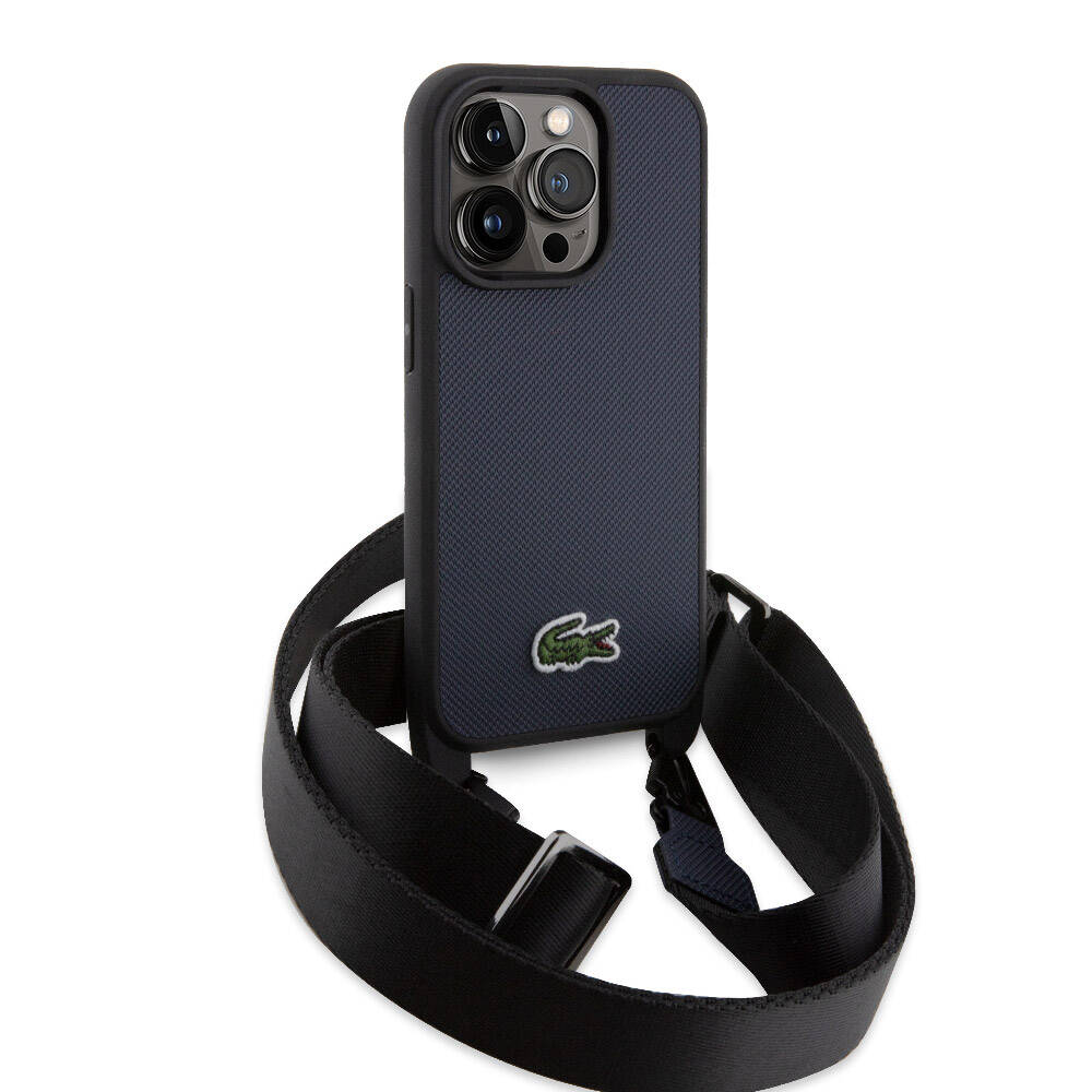 Apple iPhone 14 Pro Max Kılıf Lacoste Orjinal Lisanslı PU Pike Desenli Arka Yüzey Askılı İkonik Timsah Dokuma Logolu Kapak Lacivert