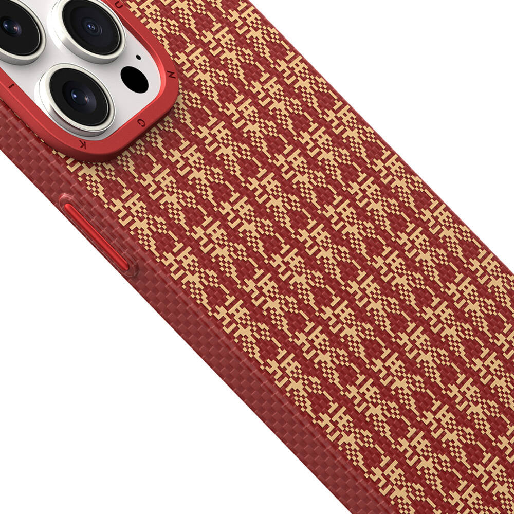 Apple iPhone 14 Pro Max Kılıf M-safe Şarj Özellikli Kevlar 1500D Youngkit Auspicious Loong Serisi Kapak Kırmızı