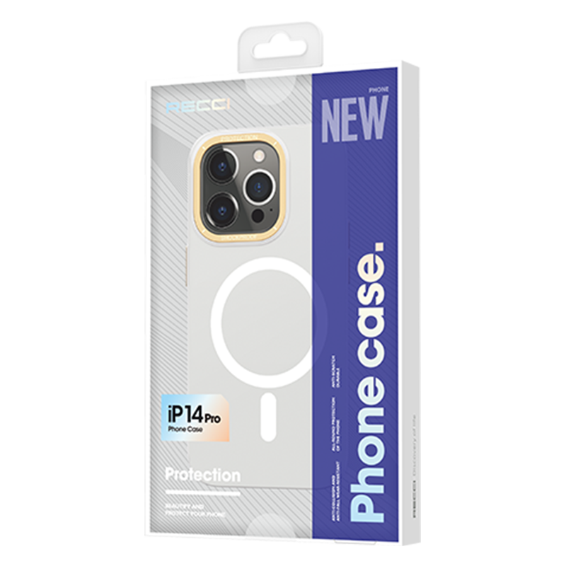 Apple iPhone 14 Pro Max Kılıf M-safe Şarj Özellikli Metal Kamera Çerçeveli Recci Glaze Serisi Kapak Beyaz