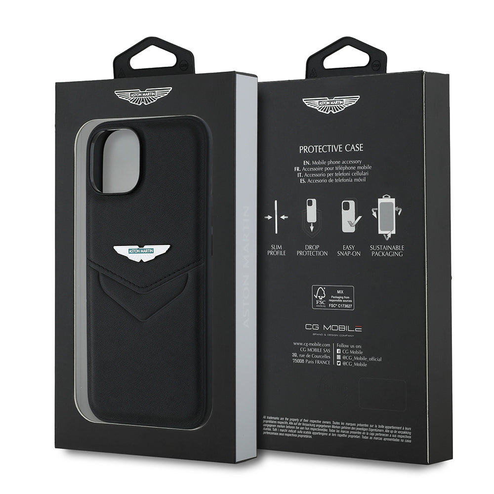 Apple iPhone 15 Kılıf Aston Martin Orjinal Lisanslı Victory Dizayn PU Deri Metal Logolu Kapak Siyah