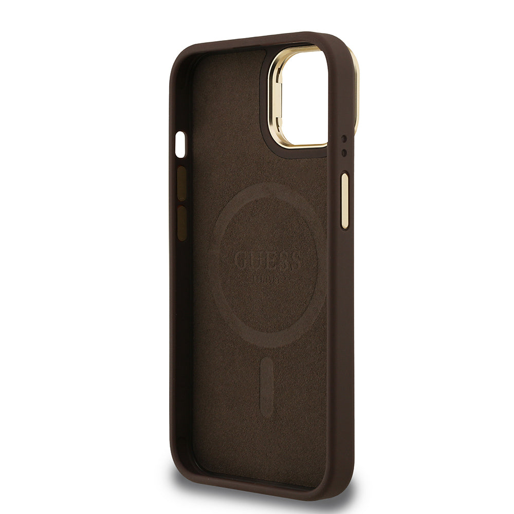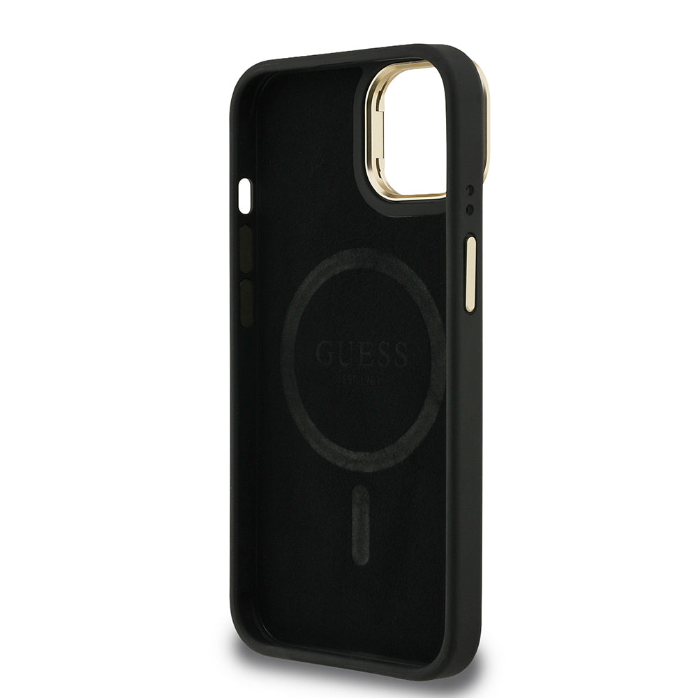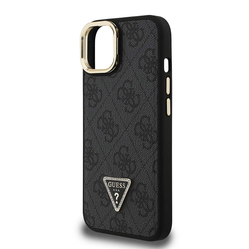 iPhone 15 Kılıf Guess Orjinal Lisanslı PU Deri Taşlı Üçgen Logo 4G Desenli Kamera Standlı Kapak