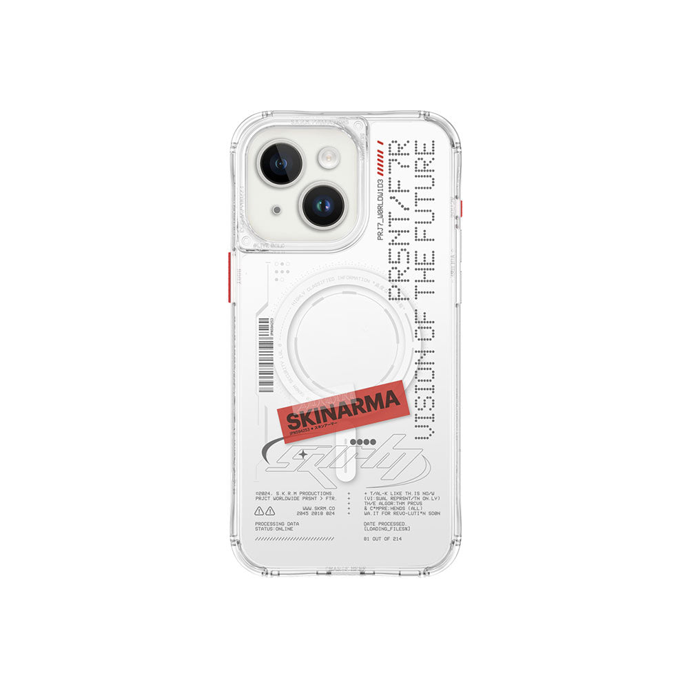 Apple iPhone 15 Kılıf SkinArma M-safe Şarj Özellikli Yazı Desenli Airbag Tasarımlı Orion Kapak Renksiz