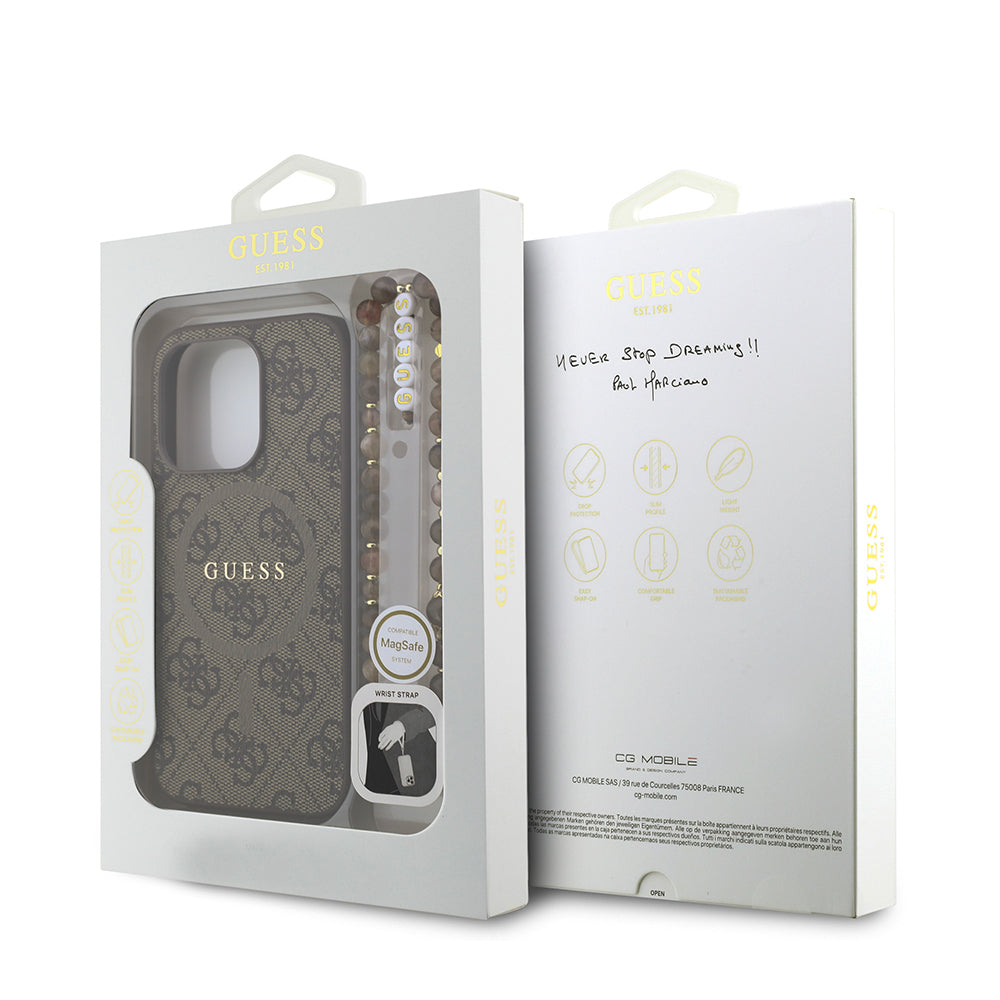 Apple iPhone 15 Pro Kılıf Guess Orjinal Lisanslı M-safe Şarj Özellikli PU Deri Bilek Askı İpli Yazı Logolu Kapak Kahverengi