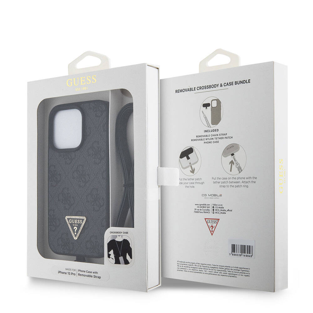 Apple iPhone 15 Pro Kılıf Guess Orjinal Lisanslı PU Deri Askılı Taşlı Üçgen Logo 4G Desenli Strass Crossbody Kapak