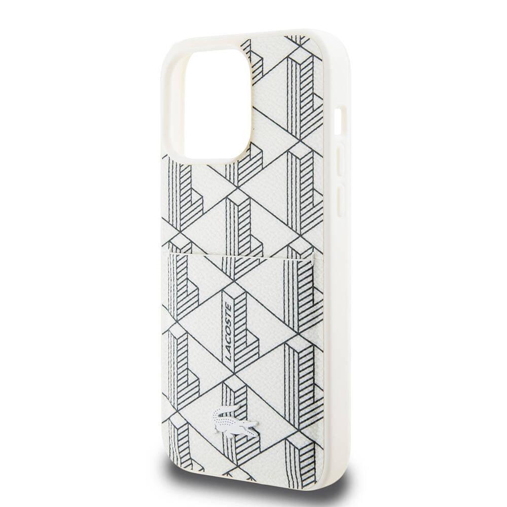 Apple iPhone 15 Pro Kılıf Lacoste Orjinal Lisanslı M-safe Şarj Özellikli PU Deri Görünümlü Kartlıklı Karışık Monogram Desenli Kapak Beyaz