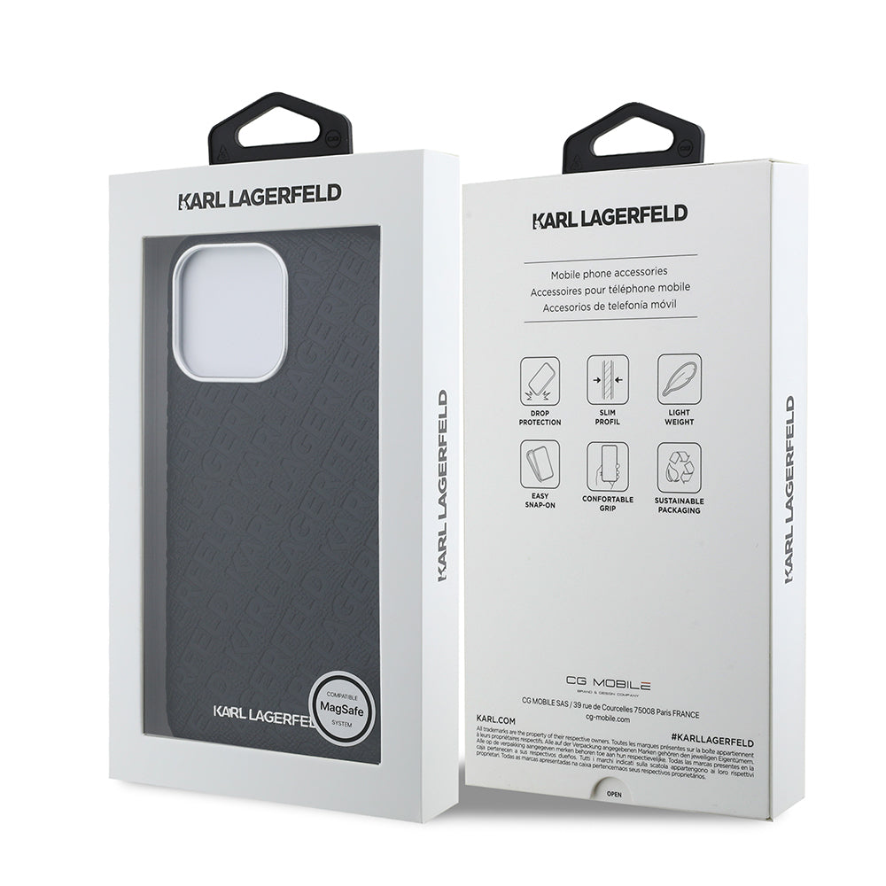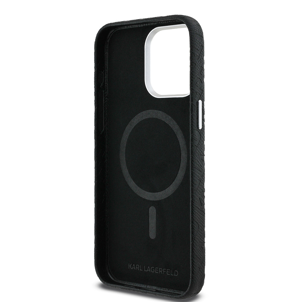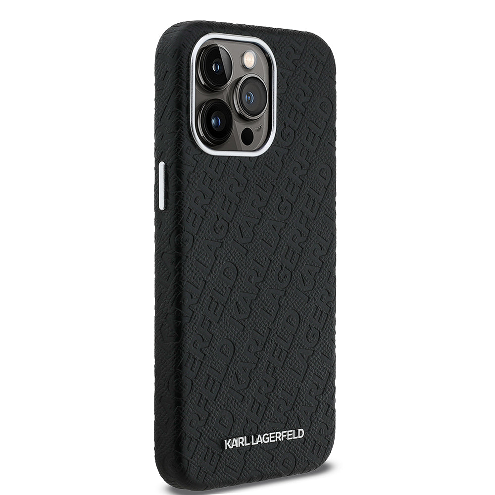 Apple iPhone 15 Pro Max Kılıf Karl Lagerfeld Orjinal Lisanslı PU Deri Damgalı Metal Yazı Logolu Kapak Siyah