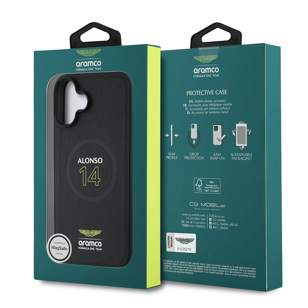 Apple iPhone 16 Plus Kılıf Aston Martin Orjinal Lisanslı M-safe Şarj Özellikli PU Deri Alonso 14 Baskılı Kapak Siyah