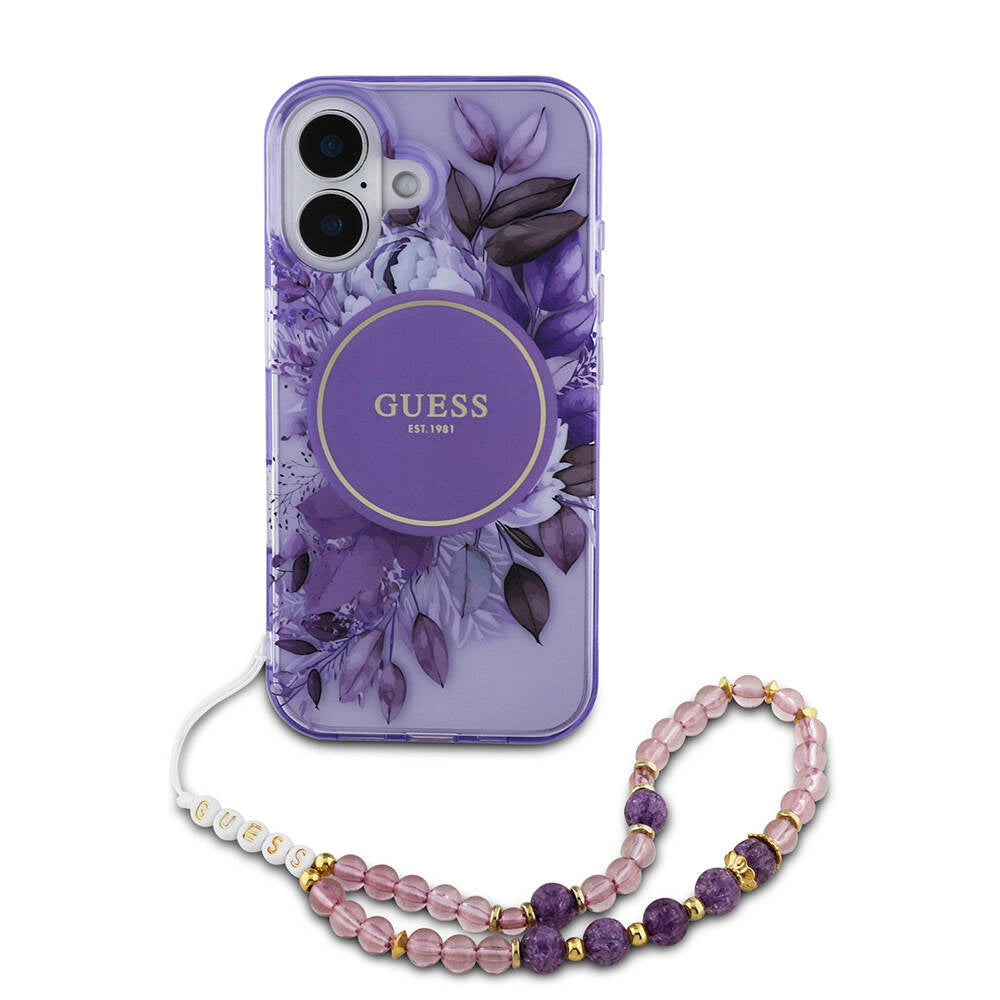 Apple iPhone 16 Plus Kılıf Guess Orjinal Lisanslı M-safe Şarj Özellikli IML Baskılı Çiçek İnci Bileklikli Kapak Mor