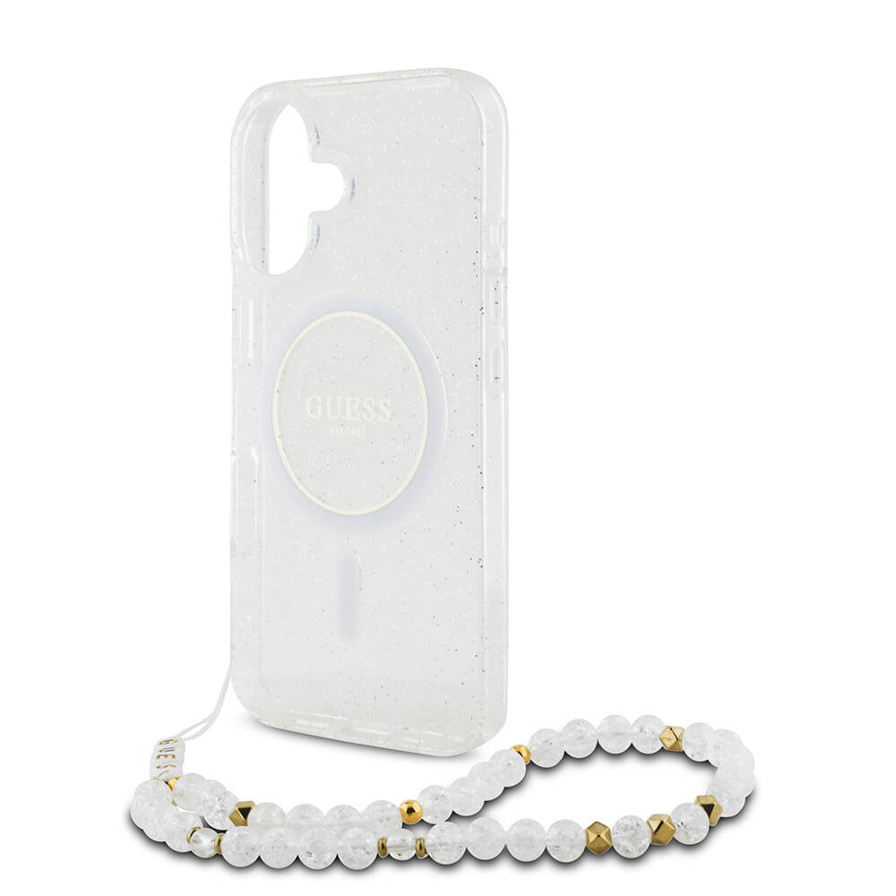 iPhone 16 Plus Kılıf Guess Orjinal Lisanslı Magsafe Şarj Özellikli Simli Silikon İnci Bileklikli Kapak