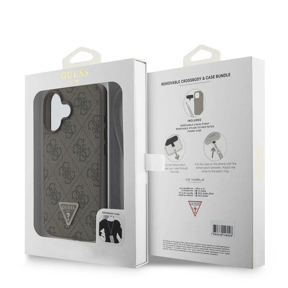 Apple iPhone 16 Plus Kılıf Guess Orjinal Lisanslı PU Deri Taşlı Metal Üçgen Logolu Çapraz Vücut Askılı 4G Desenli Kapak Kahverengi
