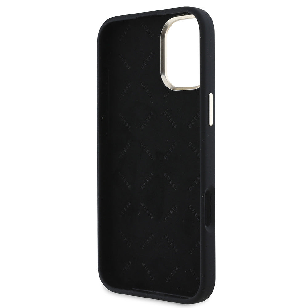Apple iPhone 16 Plus Kılıf Guess Orjinal Lisanslı Yazı ve Taşlı 4G Logolu Metal Kamera Çerçeveli Silikon Kapak Siyah