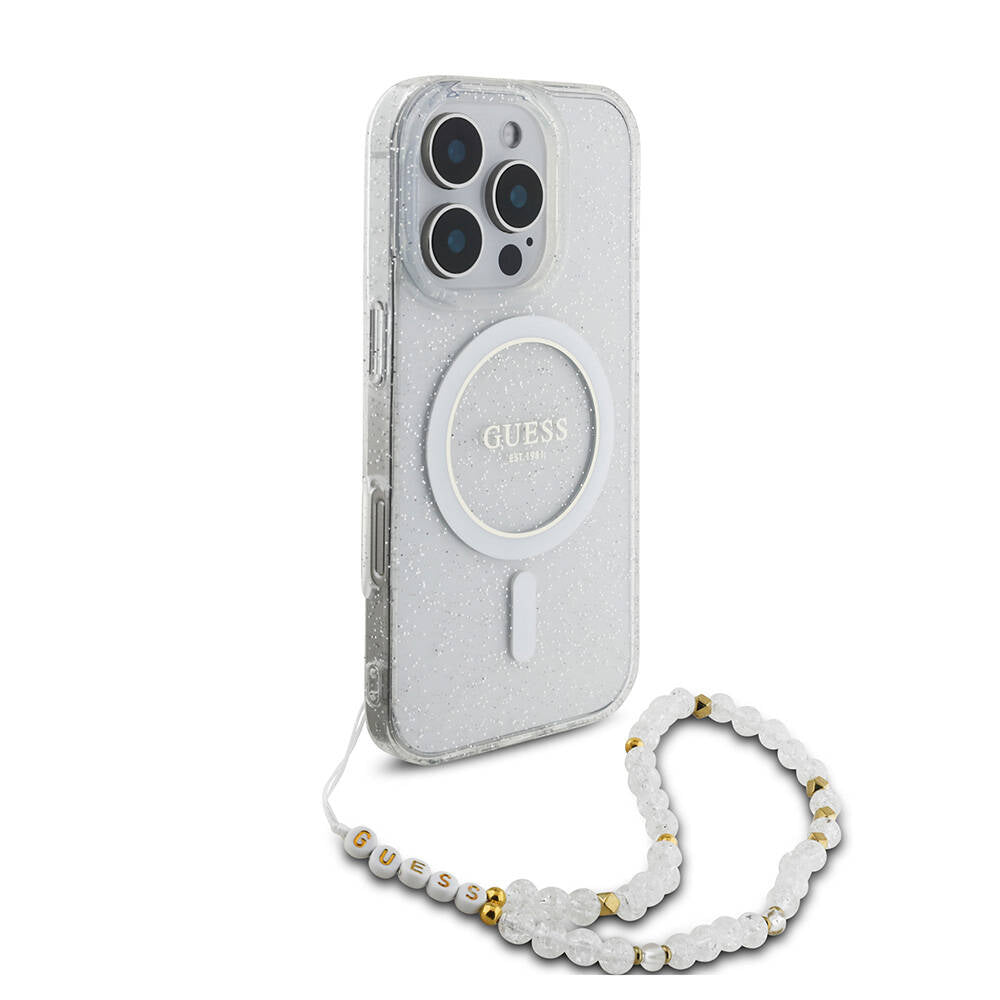 iPhone 16 Pro Kılıf Guess Orjinal Lisanslı Magsafe Şarj Özellikli Simli Silikon İnci Bileklikli Kapak