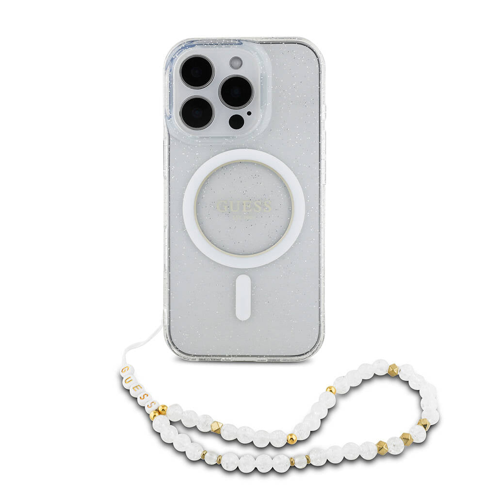 Apple iPhone 16 Pro Kılıf Guess Orjinal Lisanslı M-safe Şarj Özellikli Simli Silikon İnci Bileklikli Kapak Şeffaf