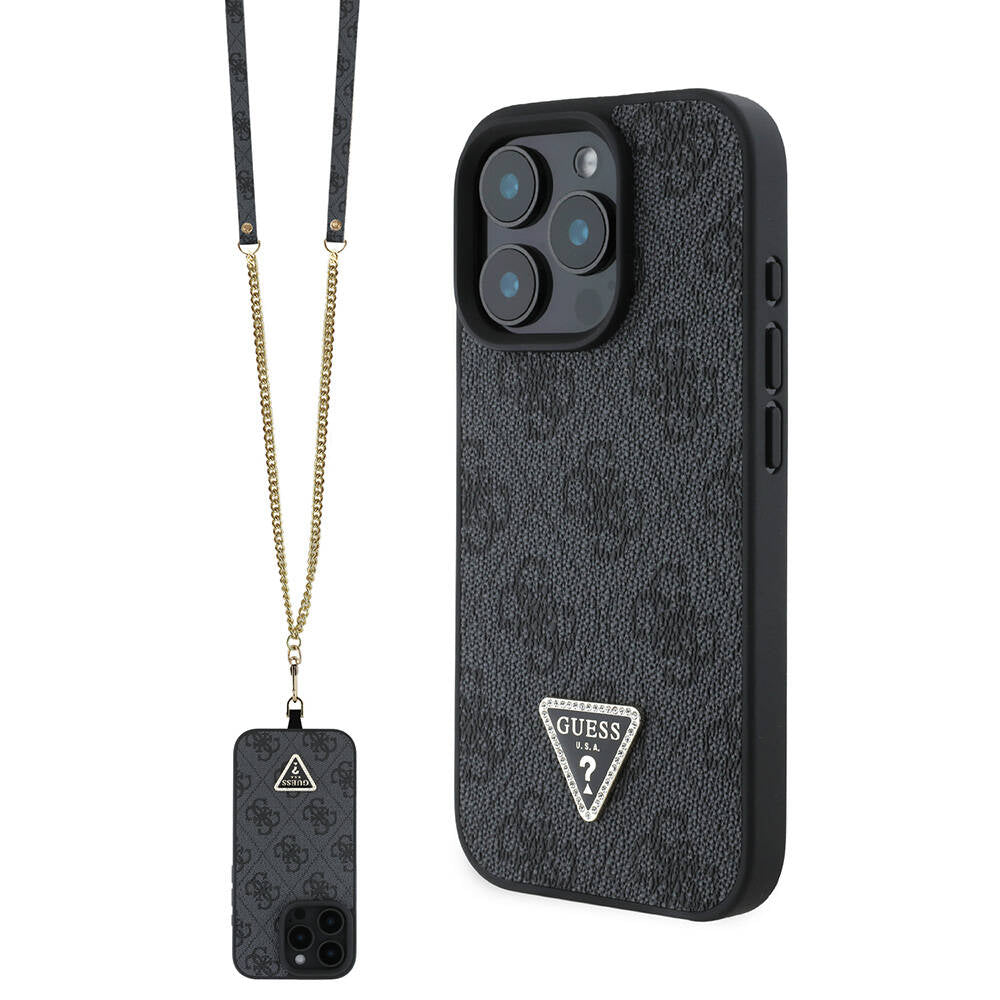 Apple iPhone 16 Pro Kılıf Guess Orjinal Lisanslı PU Deri Taşlı Metal Üçgen Logolu Çapraz Vücut Askılı 4G Desenli Kapak Siyah