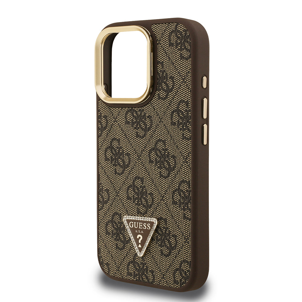 iPhone 16 Pro Kılıf Guess Orjinal Lisanslı PU Deri Taşlı Üçgen Logo 4G Desenli Kamera Standlı Kapak