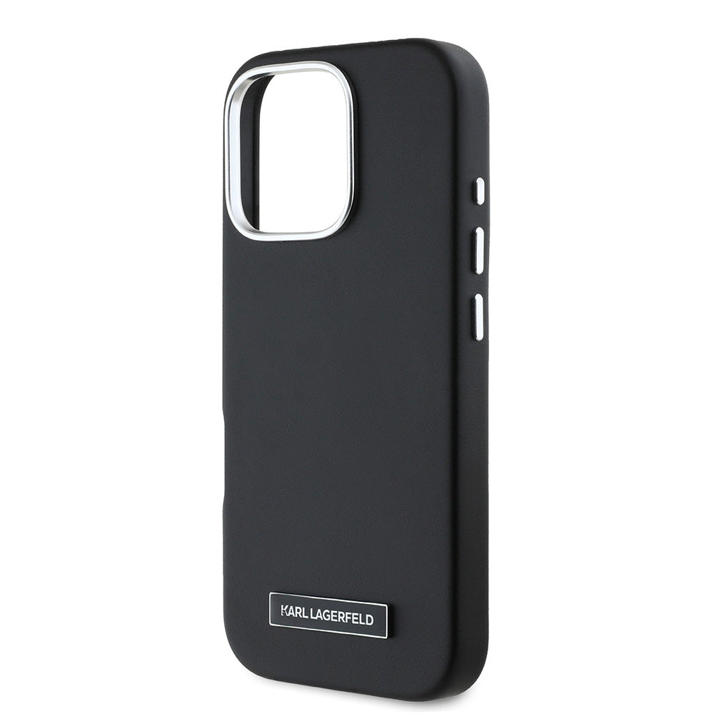 Apple iPhone 16 Pro Kılıf Karl Lagerfeld Orjinal Lisanslı M-safe Şarj Özellikli Metal Kamera ve Buton Tasarımlı Plaka Logolu PU Deri Kapak Siyah