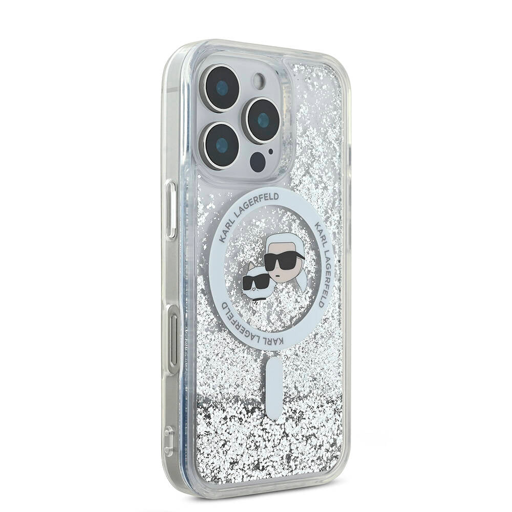 Apple iPhone 16 Pro Kılıf Karl Lagerfeld Orjinal Lisanslı M-safe Şarj Özellikli Sıvılı Simli KC Heads Kapak Şeffaf