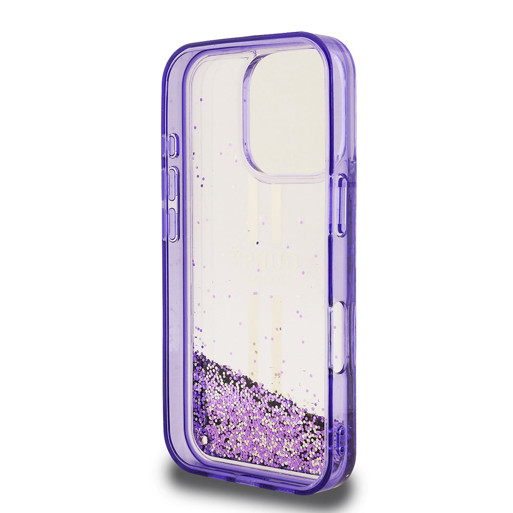 Apple iPhone 16 Pro Max Kılıf Guess Orjinal Lisanslı Transparan Sıvılı Simli Altın Çizgili Kapak Mor