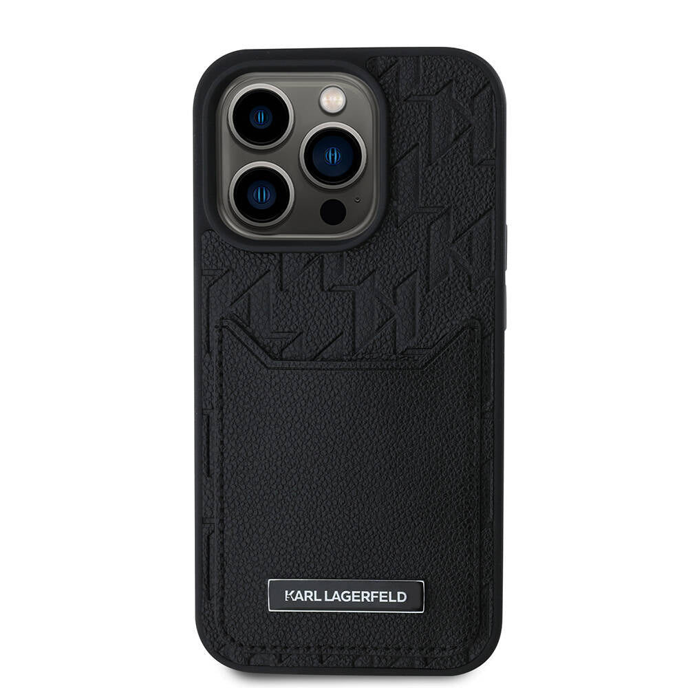 Apple iPhone 16 Pro Max Kılıf Karl Lagerfeld Orjinal Lisanslı Kartlıklı Monogram Sıcak Damgalı Elongated Logo Kapak Siyah