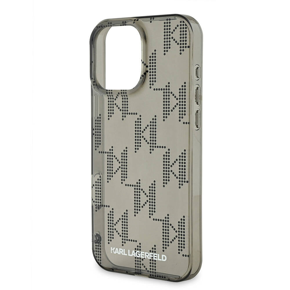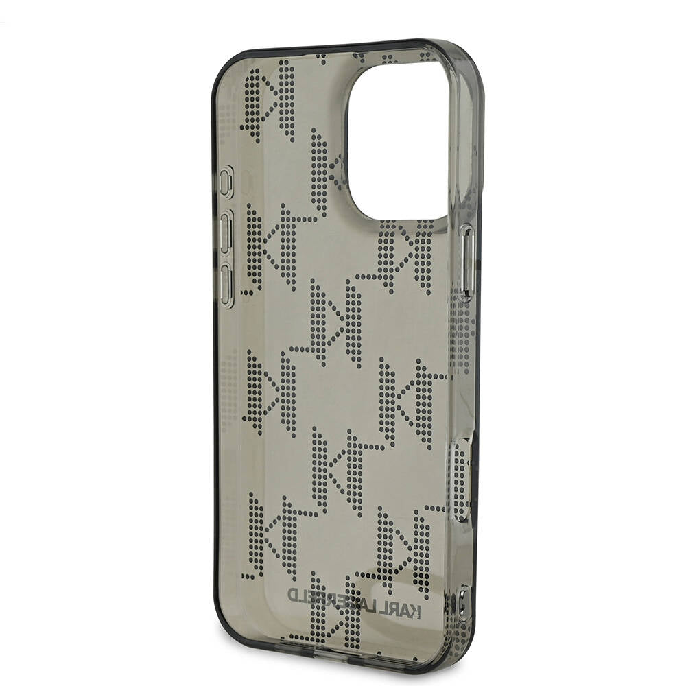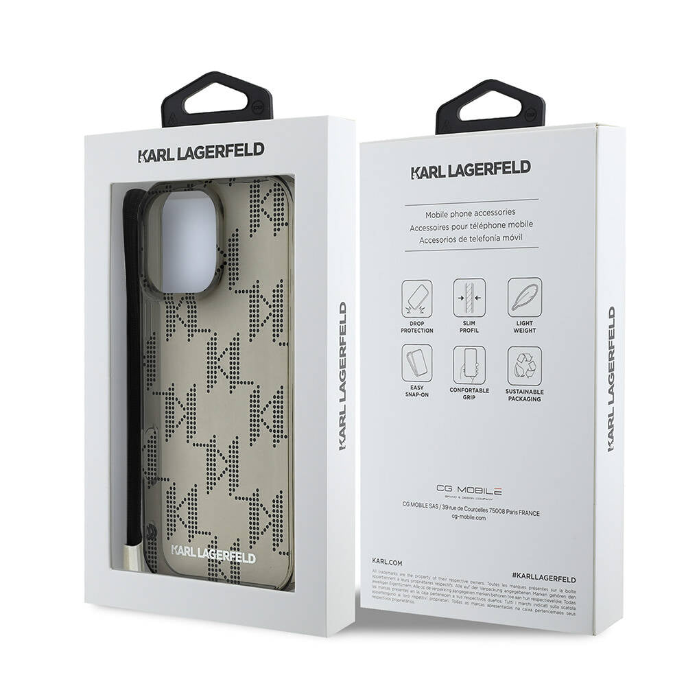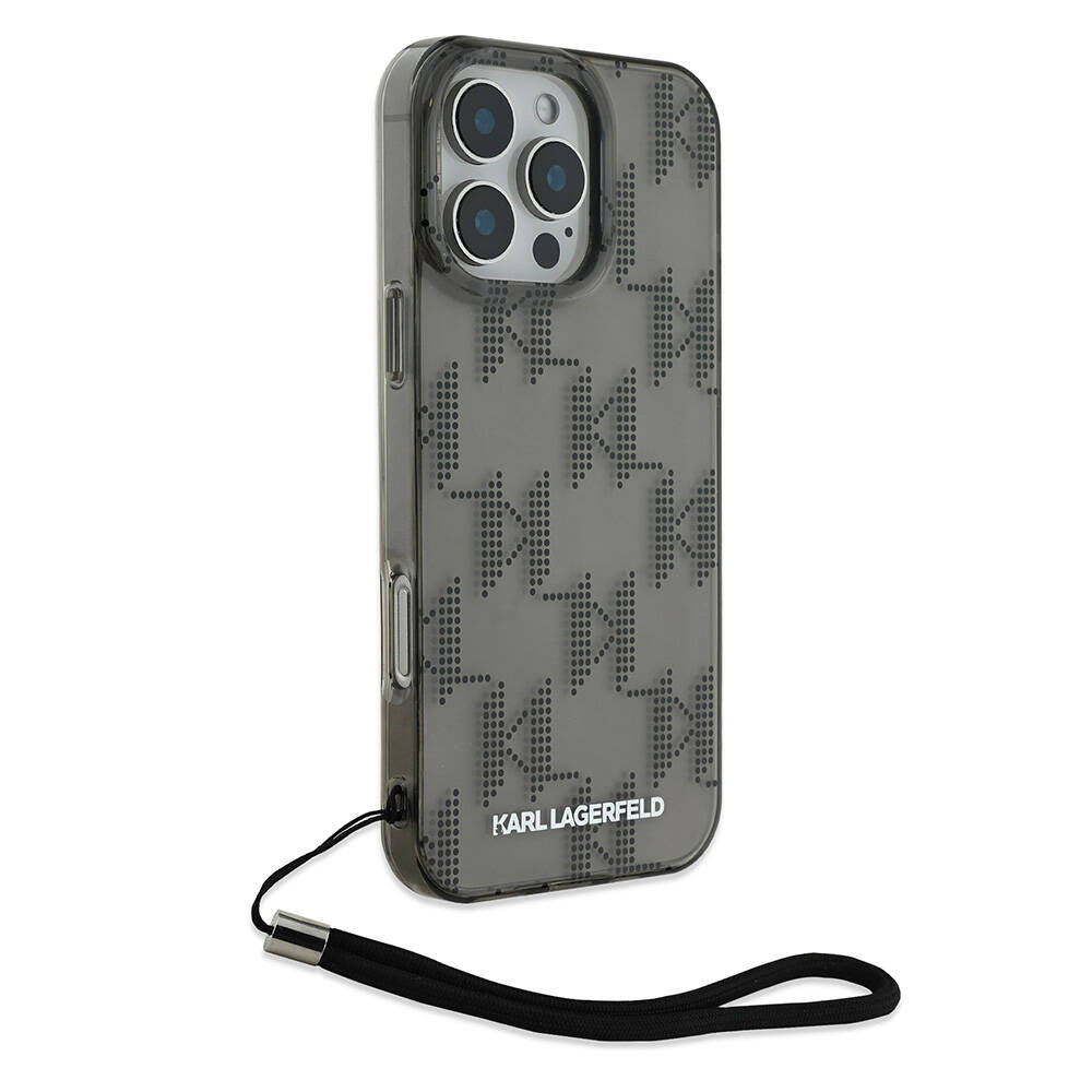 Apple iPhone 16 Pro Max Kılıf Karl Lagerfeld Orjinal Lisanslı KL Desenli Saydam Bilek Askı İpli Klasik Logolu Kapak Siyah