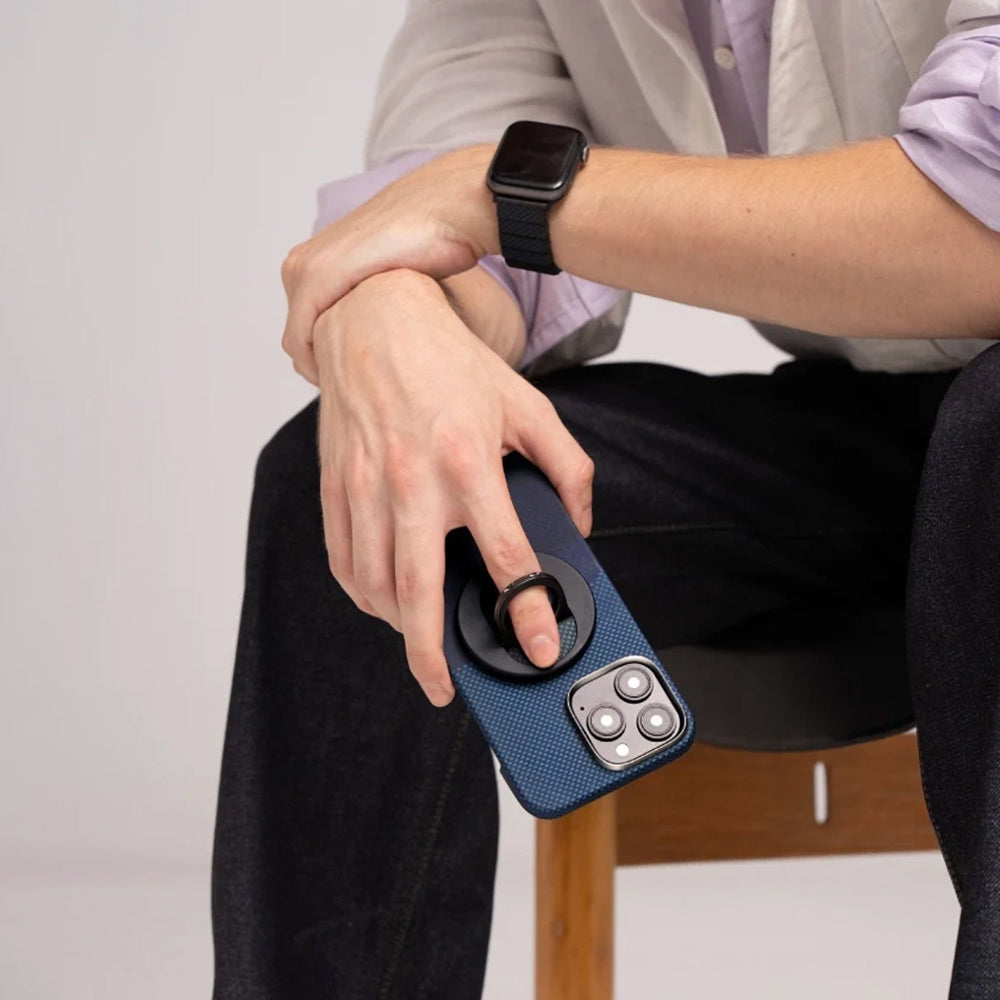Kılıfın MagSafe uyumlu Grip 3 Stand'ı, dayanıklı aramid fiber ve çinko alaşımdan üretilmiş olup, tek elle tutuşu kolaylaştıran çift halkalı tasarımı ile dikkat çeker. Güçlü manyetik kuvveti sayesinde telefonu güvenle taşır; çekim gücü 1.2kg’a kadar dayanıklıdır. 5.9mm kalınlığı ile cepte taşınabilir olup, masaya yerleştirildiğinde telefonunuzu sabit tutarak lenslerin çizilmesini engeller. Fotoğraf çekerken, arama yaparken veya video izlerken her an elinizin altında rahatça kullanılabilir.
