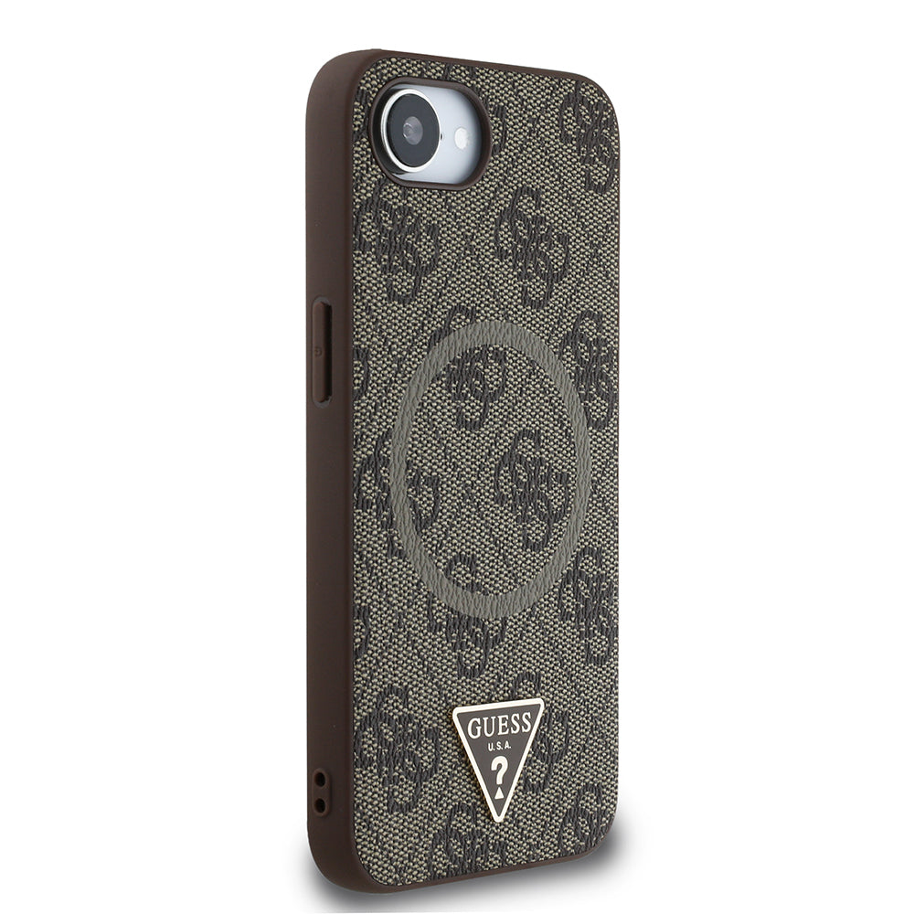 Apple iPhone 16E Kılıf Guess Orjinal Lisanslı M-safe Şarj Özellikli PU Üçgen Logo 4G Desenli Kapak Kahverengi