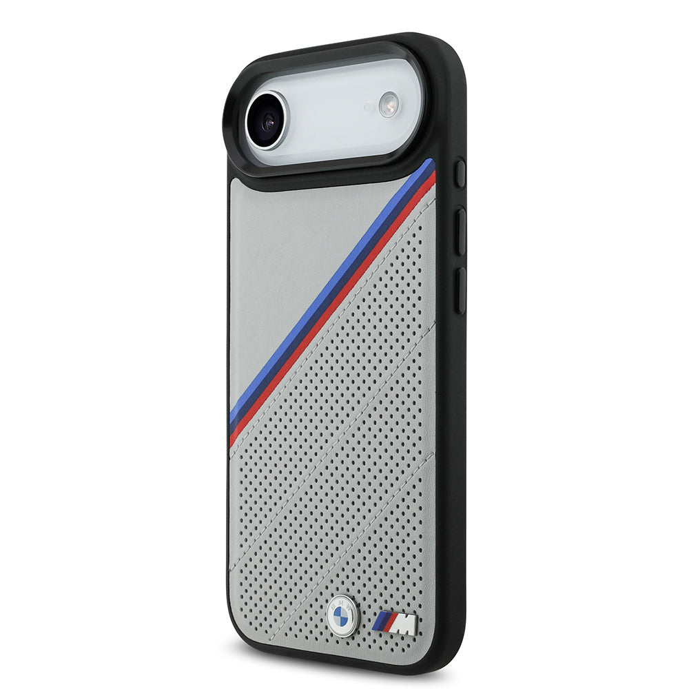 Apple iPhone 17 Air Kılıf BMW Orjinal Lisanslı M-safe Şarj Özellikli M Logolu Üç Şeritli Delikli Deri Kapak Gri