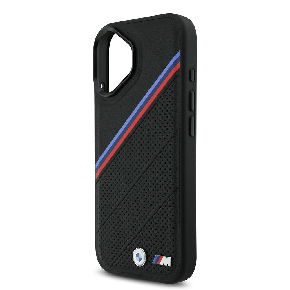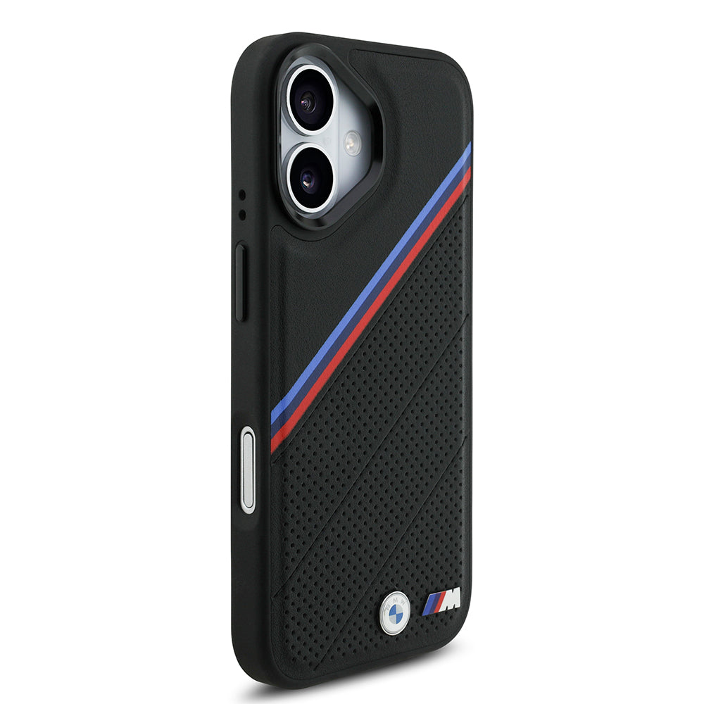 iPhone 17 Kılıf BMW Orjinal Lisanslı M-safe Şarj Özellikli M Logolu Üç Şeritli Delikli Deri Kapak