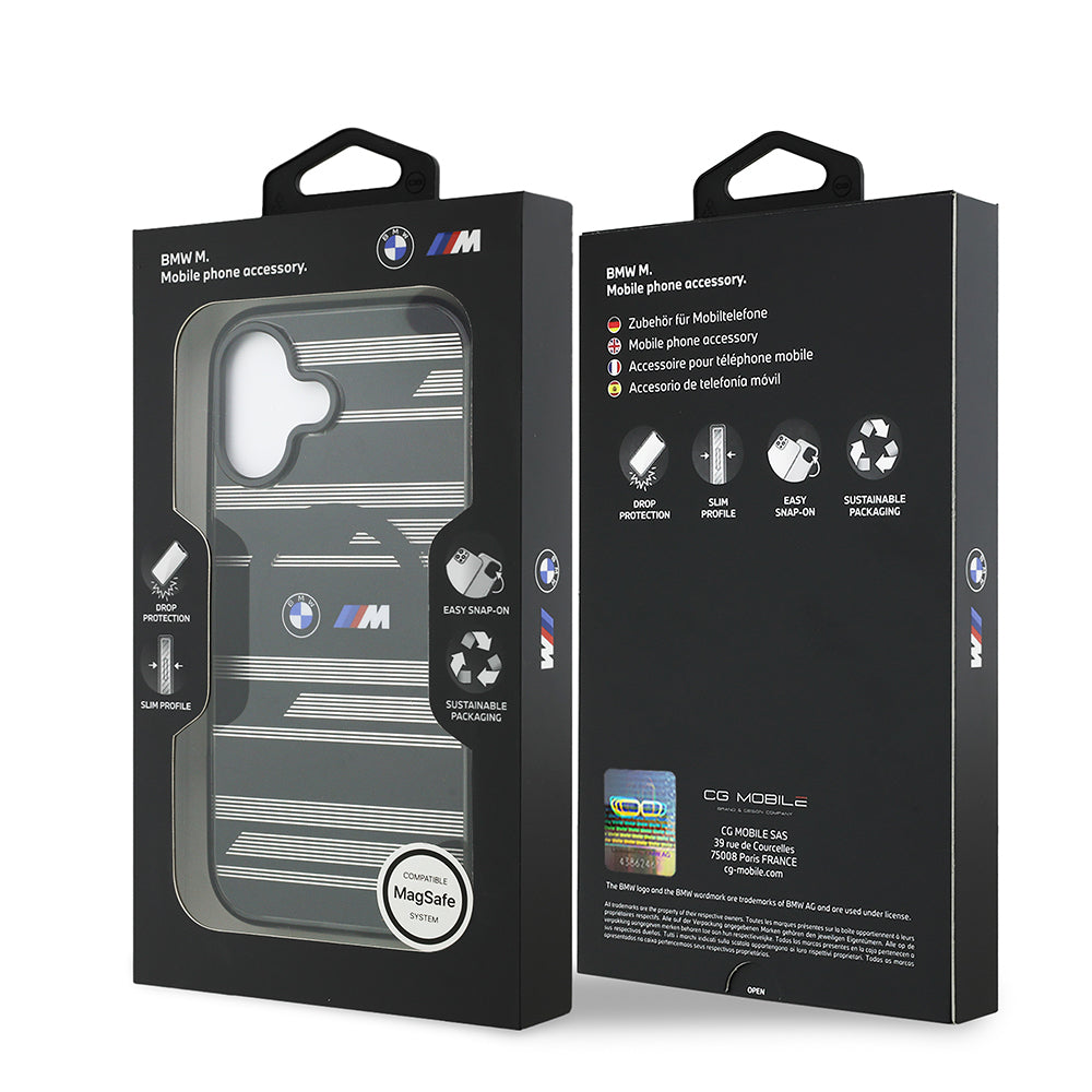 Apple iPhone 17 Kılıf BMW Orjinal Lisanslı M-safe Şarj Özellikli Metal Kamera Butonlu Yatay Şeritli M Dizayn Kapak Siyah