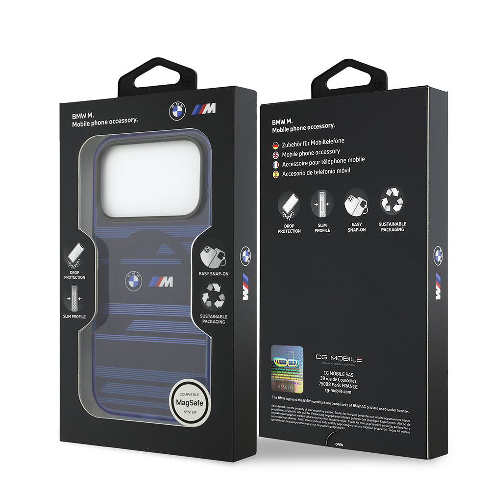 Apple iPhone 17 Pro Kılıf BMW Orjinal Lisanslı M-safe Şarj Özellikli Metal Kamera Butonlu Yatay Şeritli M Dizayn Kapak Mavi