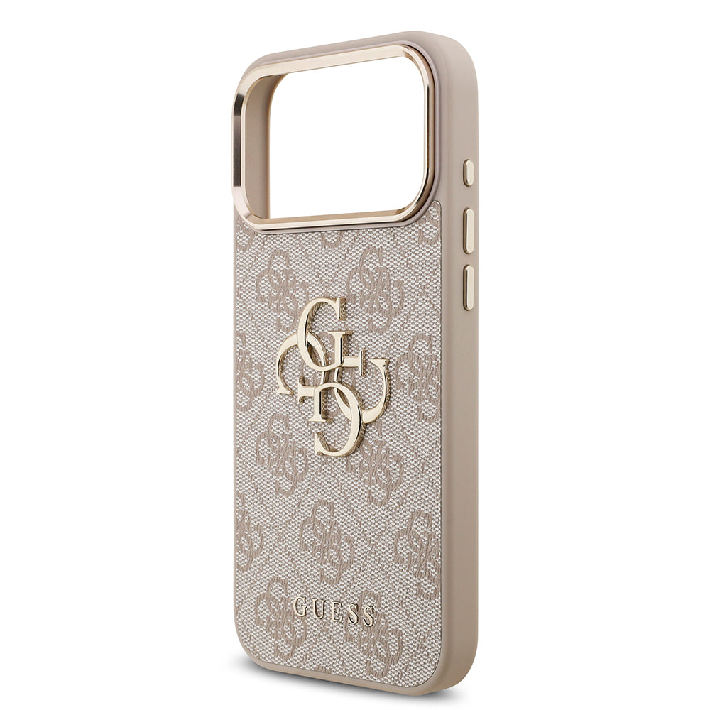 Apple iPhone 17 Pro Max Kılıf Guess Orjinal Lisanslı Gold Metal Kamera Çerçeveli 4G Desenli Metal Büyük 4G ve Yazı Logolu Kapak Pembe