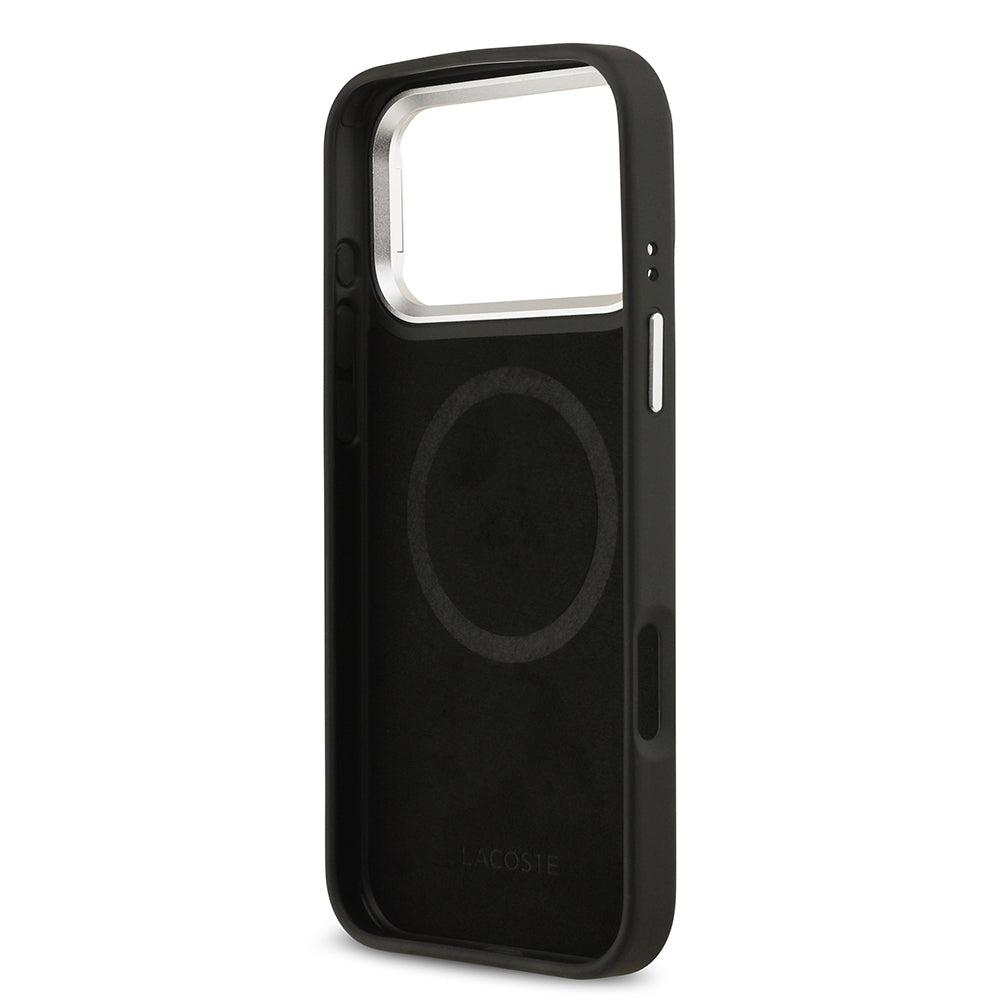 Apple iPhone 17 Pro Max Kılıf Lacoste Orjinal Lisanslı M-safe Şarj Özellikli PU Pike Desenli Standlı Metal Logolu Kapak Siyah