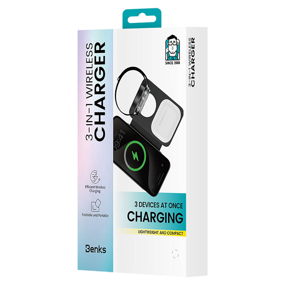 Benks W12-01 Telefon&Akıllı Saat&Kulaklık İçin 15W 3in1 Katlanabilir Magnetik Kablosuz Şarj Standı