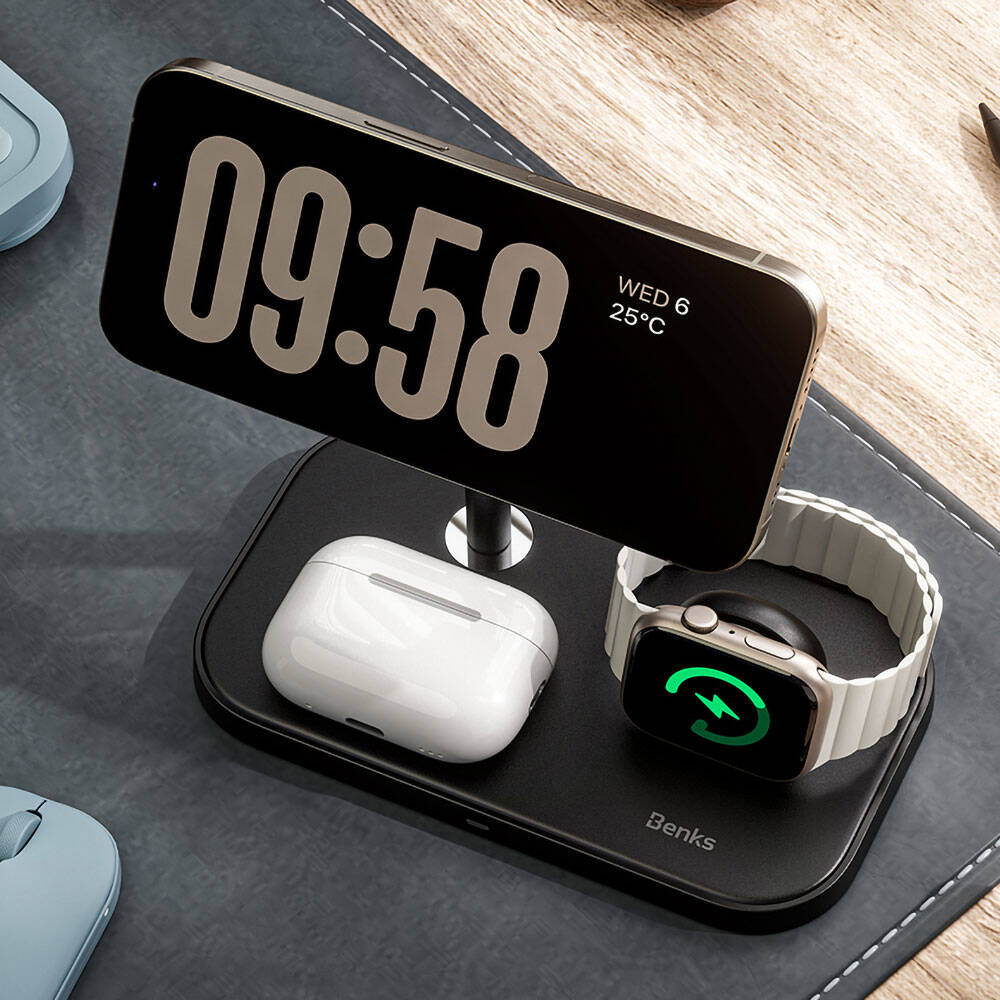 Benks W16, iPhone, Apple Watch ve AirPods'unuzu aynı anda şarj edebilen üçü bir arada şarj standıdır. Bu yenilikçi şarj standı, masanızı düzenli tutarken tüm cihazlarınızı hızlı ve verimli bir şekilde şarj etmenize olanak tanır.